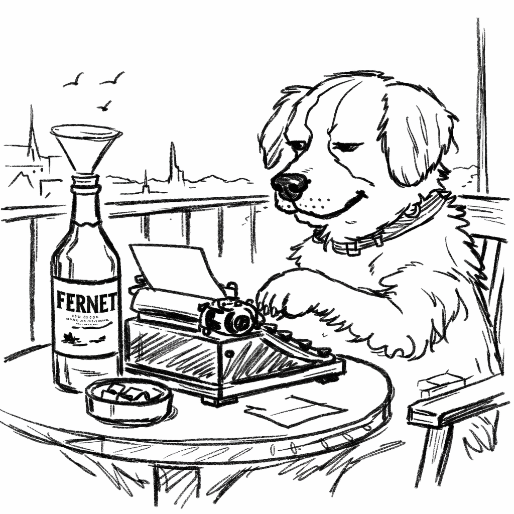 Protože nemá šikovný přední tlapy, chodí mu pásku vždycky vyměňovat pan Jiří, fotograf. Poseděj spolu, popijou, pes nemá šikovný přední tlapy a tak mu pan Jiří leje fernet trychtýřem přímo do krku, což pes s povděkem kvituje: „Haf, haf.“