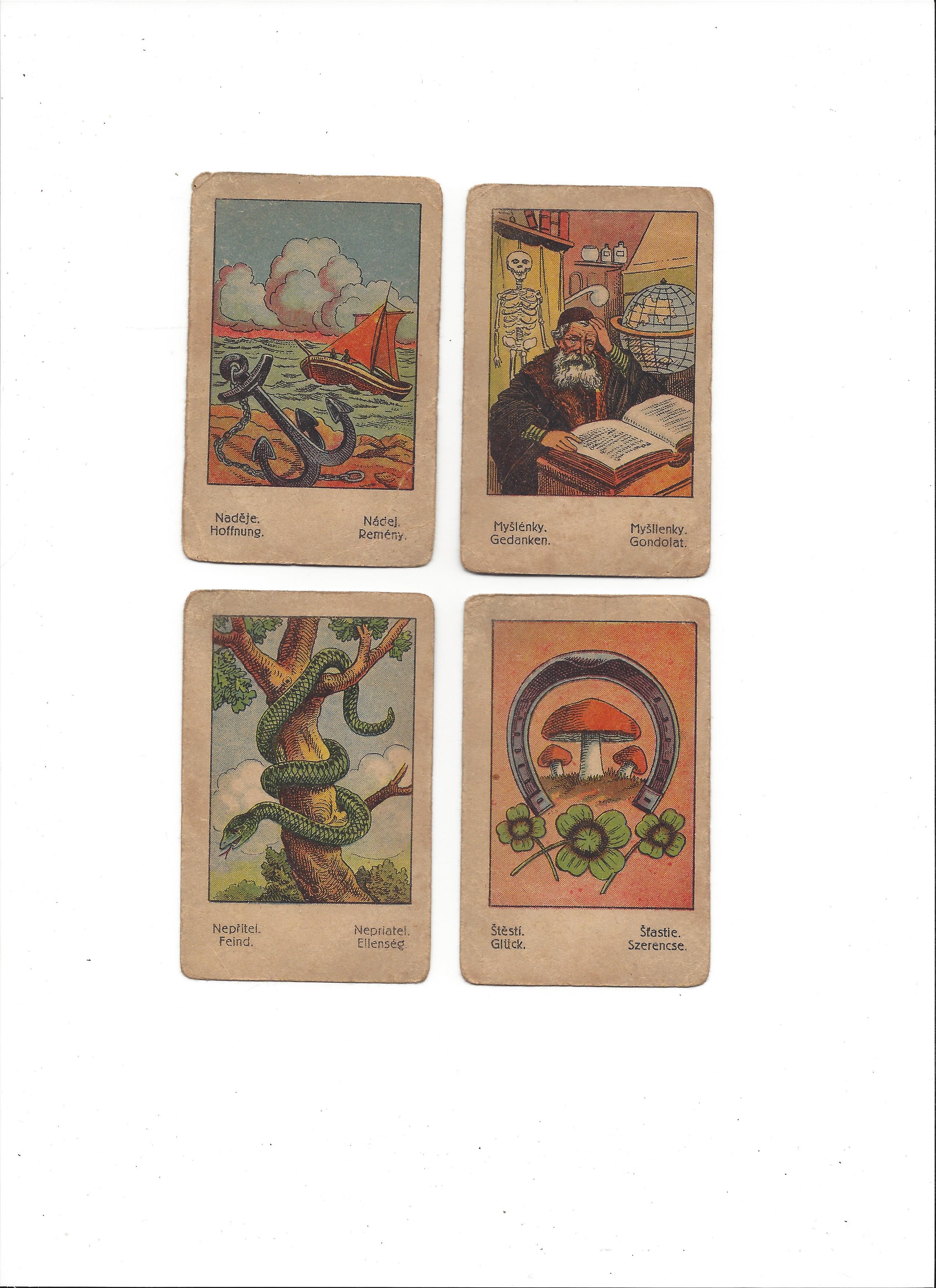 V šuplíku po babičce jsem nalezla karty. Možná vykládací? Některé sem dám, pokud víte co s nimi, poraďte. Děkuji. Třeba u hada jsou nápisy: Nepřítel, Feind, Nepriatel, Ellnség. To poslední je asi maďarsky.