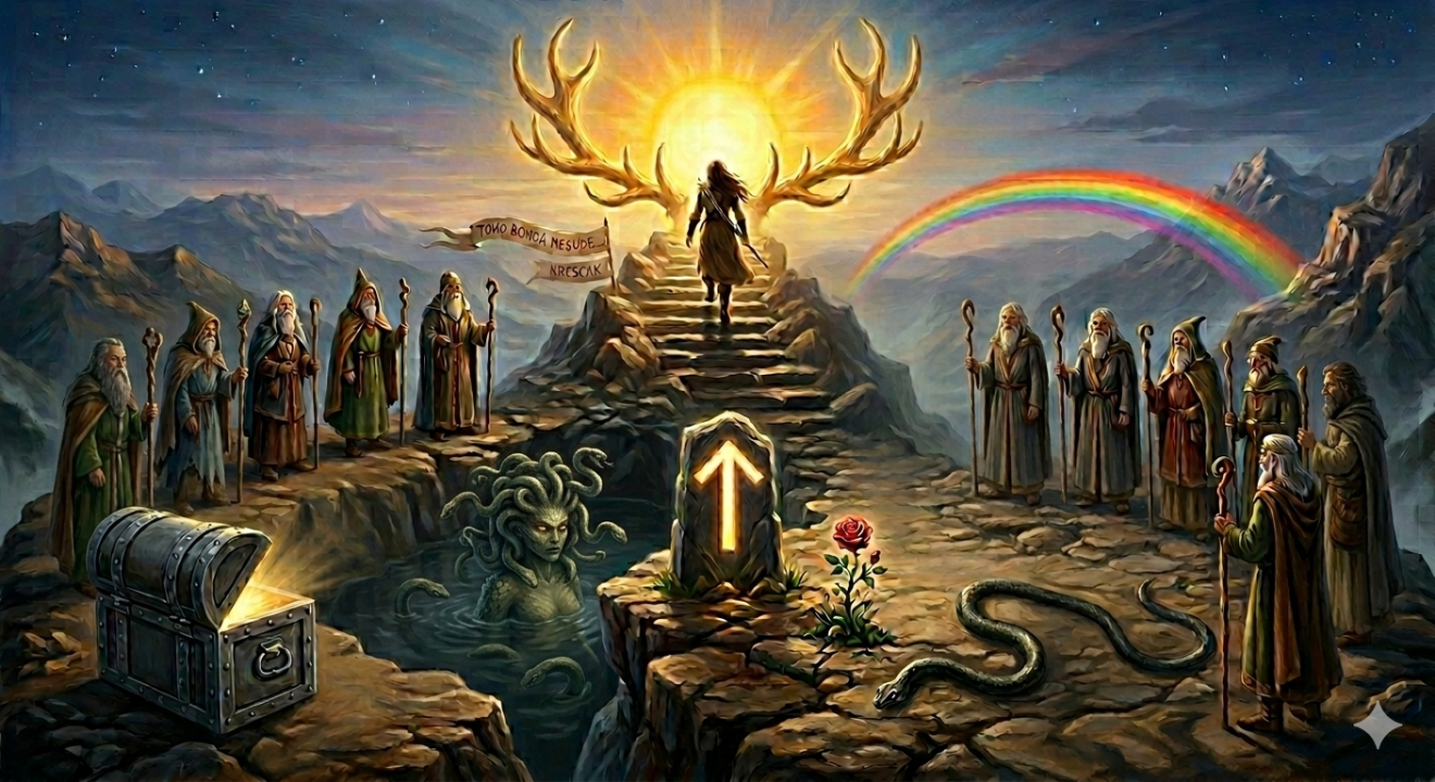 Stojím v kruhu dvanácti mudrců a s jejich šípy se po duhových schůdcích vydávám k cíli do Slunce mezi Zlatými Parohy.”
