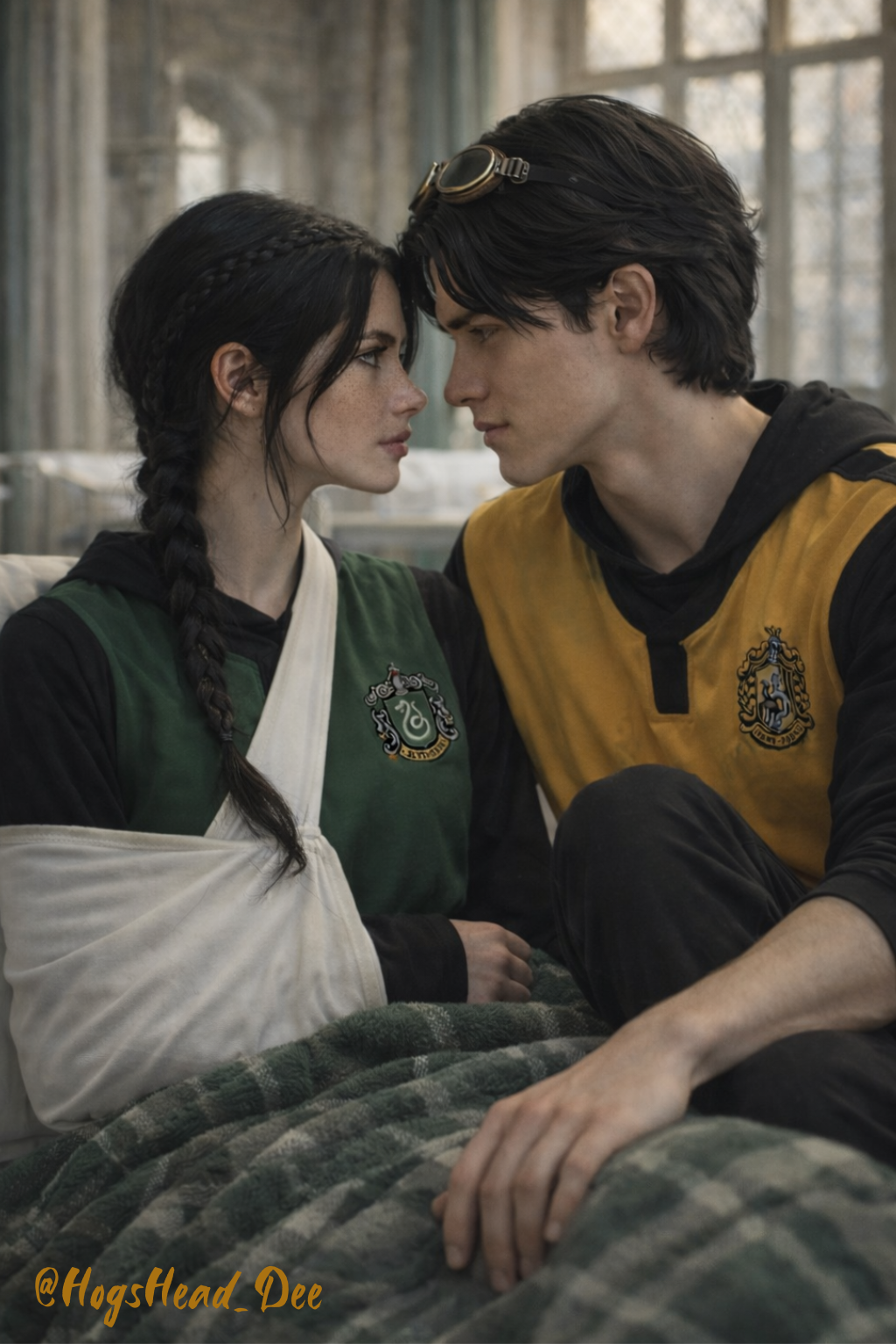 Byl zrovna čas oběda, když Dylan, teď už převlečený v ležerním tričku a kalhotách, vcházel do Velké síně. Jeho pohled samovolně sklouzl ke Zmijozelskému stolu, kde zahlédl jejich famfrpálový tým, ale osoba, kterou hledal, mezi nimi nebyla. Svraštil obočí a zastavil se nedaleko svého kolejního stolu. Nakonec zavrtěl hlavou a obrátil se k odchodu. Než po cestě stačil najít racionální důvod, proč by to dělal, jeho kroky ho zanesly na ošetřovnu, která byla téměř prázdná. Procházel kolem ustlaných postelí, zástěn přitisknutých ke zdi a namířil si to přesně k tomu místu, které bylo obsazené. Déianeira seděla opřená zády o polštář, přikrytá dekou až k pasu a soustředila se na knihu, kterou měla v pravé ruce. Rameno v závěsu si podložila bílým bulánkem z vedlejší postele a modřiny se škrábanci na jejím obličeji zmizely. Dlouhé, rozcuchané vlasy jí splývaly podél ramen v lehkých vlnách.