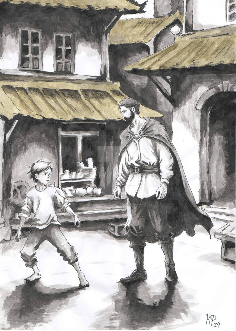 Ta otázka v obecné řeči se nesla vzduchem, naplněná překvapením a zmatením. Bylo časné odpoledne a Nita, zrovna procházející mezi stánky na tržišti gobliní vesnice, se zarazila, jakmile ji zaslechla. Otočila se a její oči se střetly s pohledem cizince — člověka. Svou výškou vyčníval mezi okolními gobliny, které ona sama začala teprve přerůstat. Byl to štíhlý muž s vousy a opálenou kůží, jejíž barva jí připadala nezvyklá. Přes ramena měl přehozený otrhaný plášť a jeho košile, zjevně kdysi bílá, byla nyní zašedlá a potrhaná, jako by si prošla mnoha bouřemi. Na hlavě měl tmavé vlasy, zplihlé a slepené od slané vody. Nita na něj jen mlčky zírala, její srdce začínalo bít rychleji. V hlavě se jí honily různé myšlenky – běžet pryč? Zůstat stát? Je to člověk? Proč mluvil s gobliny? Proč mluví na NI?
