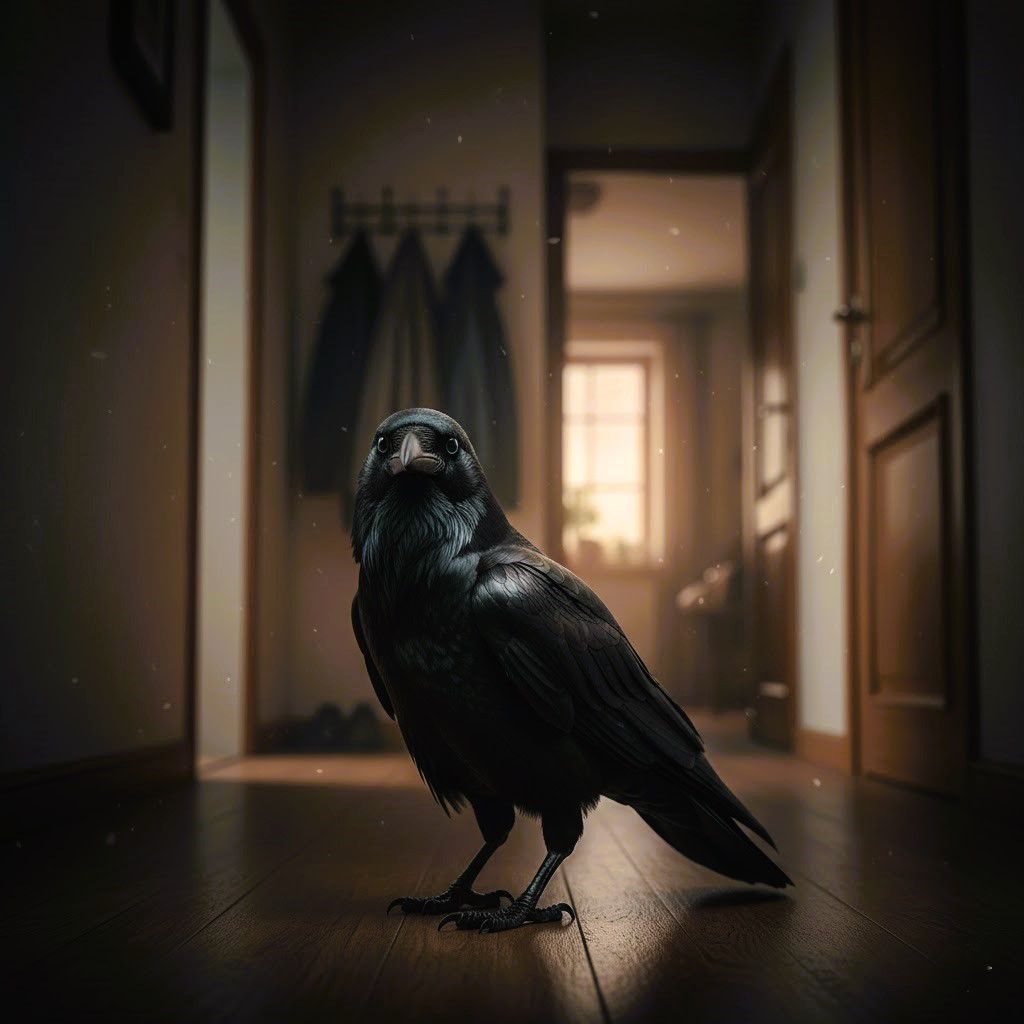 Černá jako uhel, oči jako dva studené modré body. Ne pohled ptáka – ale pohled něčeho, co ví. Co čeká. Co sleduje.