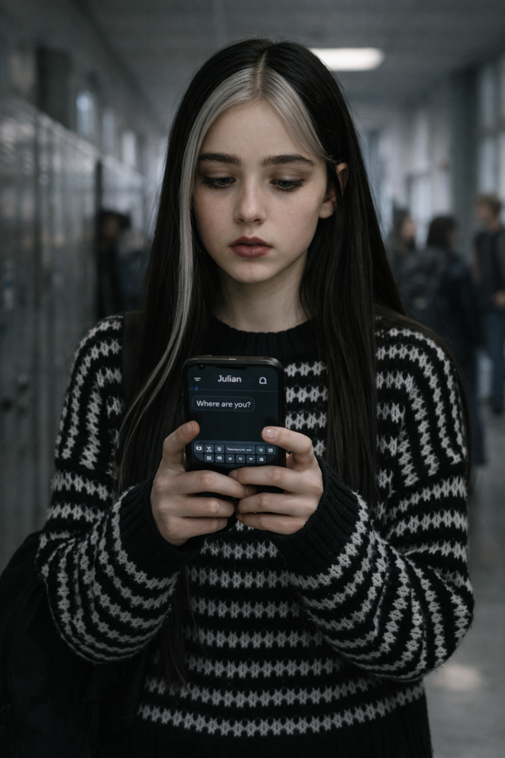 Došla ke své skříňce, cpala si věci do batohu, zabouchla ji a rozhlížela se po Julianovi.