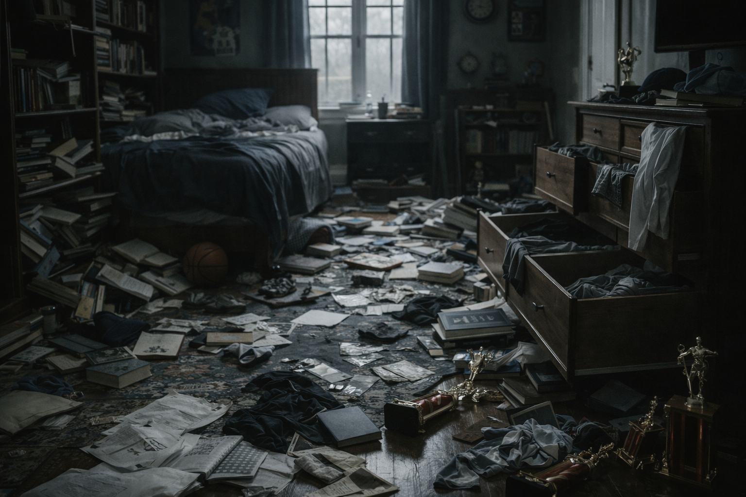 Knížky popadané z polic. Trofeje z basketu pohozené na zemi. Šuplíky otevřené, věci rozházené, jako by tu někdo zuřil.