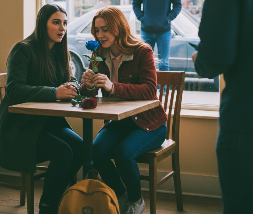 Když se uklidnily, dorazila k jejich stolu baristka — v ruce dvě růže, jednu červenou a jednu modrou.